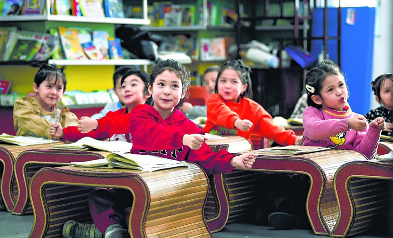 3月9日,乌鲁木齐市天山区二道桥街道固原巷社区的孩子们在社区国学课堂朗诵诗词。通过学习中华优秀传统文化,让中华民族共同体意识根植孩子们心灵深处。石榴云/新疆日报记者 汤永摄