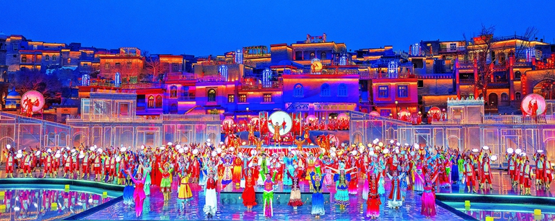演员在中央广播电视总台2024年春节联欢晚会新疆喀什分会场表演开场舞《鼓舞龙腾》(2024年2月9日摄)。石榴云/新疆日报记者 约提克尔·尼加提摄