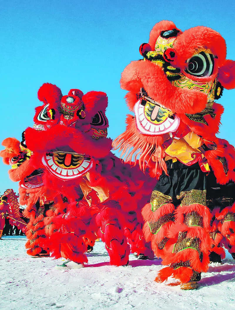 群众在叶城县七星岛景区表演舞狮(2023年12月30日摄)。石榴云/新疆日报记者蔡增乐摄